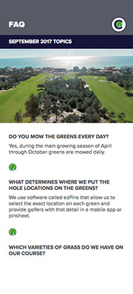 Never before has it been a possibility to communicate on such a micro basis about course conditions and actually get golfers to pay attention. You can easily show daily course setup, stimp, special conditions, etc. at the first tee. Or provide notes about specific holes. Drive traffic to the app by including daily hole locations in the Pins section, through use of the ezLocator or ezPins platform. The possibilities are endless.