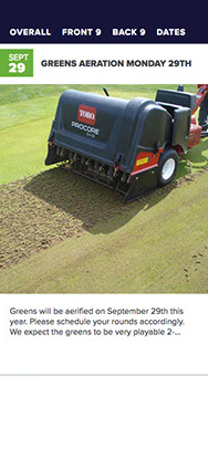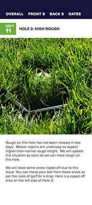 Never before has it been a possibility to communicate on such a micro basis about course conditions and actually get golfers to pay attention. You can easily show daily course setup, stimp, special conditions, etc. at the first tee. Or provide notes about specific holes. Drive traffic to the app by including daily hole locations in the Pins section, through use of the ezLocator or ezPins platform. The possibilities are endless.